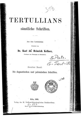 Über die Seele. (De anima) In: Tertullians sämtliche Schriften. Aus dem Lateinischen übersetzt von Karl Adam Heinrich Kellner. Köln 1882. (Translation, Deutsch)